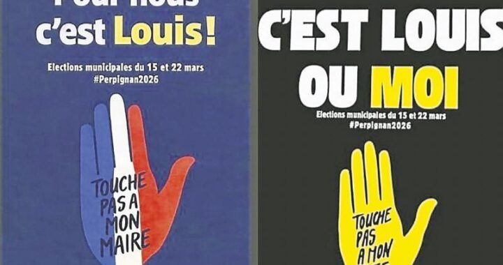 « C’est Louis ou moi » affiche SOS Racisme Perpignan sur son emblématique main jaune. L’association lance « une campagne citoyenne pour une ville antiraciste » a un mois du scrutin municipal de mars 2026. Le camp du maire de Perpignan réplique avec une main tricolore signée « Pour nous c’est Louis ».