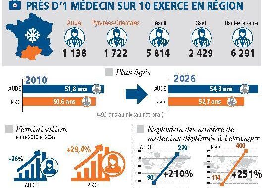 Cette progression du nombre de médecins, que beaucoup craignaient ne pas voir de sitôt, et qui n’efface pas pour autant tous les déserts médicaux (11 % des habitants d’Occitanie étaient sans médecin généraliste en 2025, 12 % dans l’Aude et les Pyrénées-Orientales), profite à la région qui, il est vrai, compte de nombreuses personnes âgées et l’infrastructure médicale adaptée.