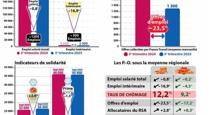 Les syndicats de salariés et le Mouvement des entreprises de France (Medef) sont d’accord sur un point : les tendances que révèlent les dernières données de l’Insee sur l’emploi en pays catalan sont de bien mauvais augure. Et pour cause: 1.200 emplois de moins entre le troisième trimestre 2024 et le troisième trimestre 2025, l’un des taux de chômage les plus élevés de France métropolitaine (12,2 %), un nombre d’allocataires du RSA qui dépasse la barre des 26.000…