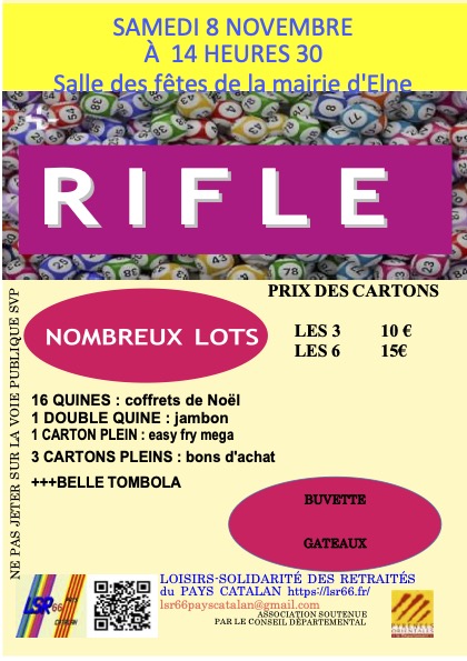 - à 14h30 – Rifle de Loisir Solidarité des Retraités. Salle des fêtes de la mairie – Elne