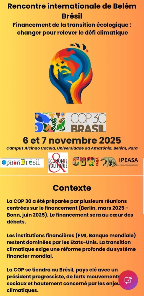 - de 18h à 21h30 – Rencontre international de Belèm (accueil et table ronde n°3 : « Action politique, Appel : Gouvernance ; Enjeux Sud-Nord ; Suites »). En visioconférence