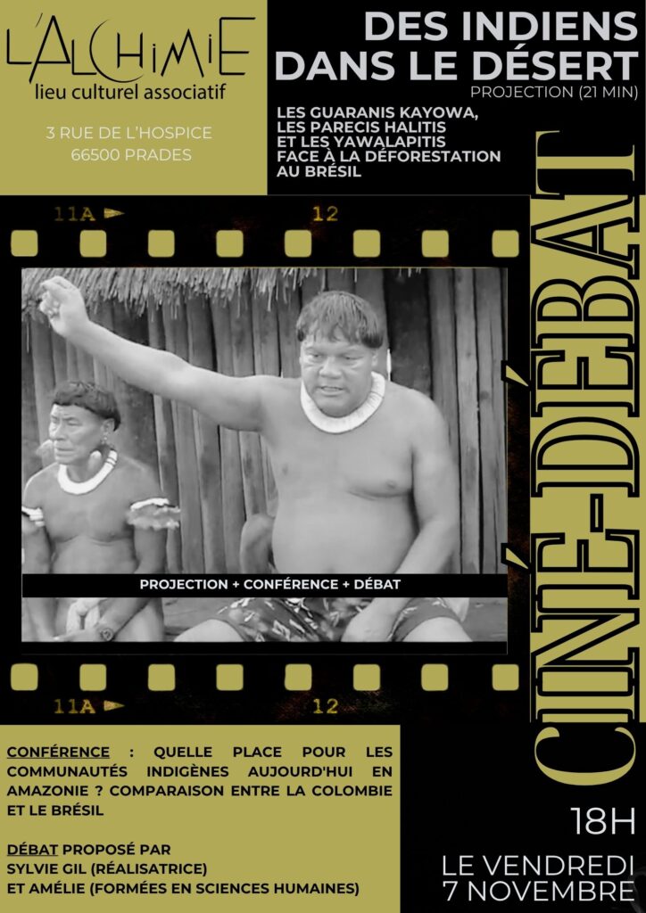 - à 18h – Projection du film « Des indiens dans le désert ». Les Guaranis Kayowa, Les Parecis Halitis et les Yawalapitis face à la déforestation au Brésil. Conférence sur quelle place pour les communautés indigènes aujourd’hui en Amazonie ? Comparaison entre la Colombie et le Brésil. Débat animé par Sylvie Gil (réalisatrice du film) et Amélie. L’alchimie, 3 rue de l’hospice – Prades