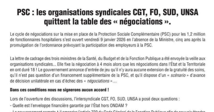 Le cycle de négociations sur la mise en place de la Protection Sociale Complémentaire (PSC) pour les 1,2 million de fonctionnaires hospitaliers s’est ouvert vendredi 9 janvier 2026 en l’absence de la Ministre, cinq ans après la promulgation de l’ordonnance prévoyant la participation des employeurs à la PSC.